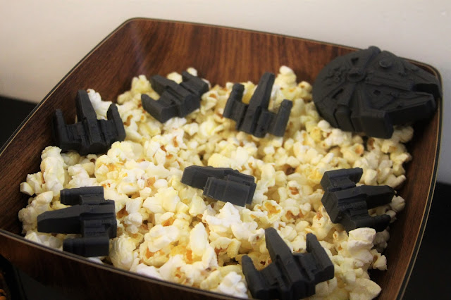Alunperin oli tarkoitus tehdä juomasekoitus, johon olisin lisännyt alusten ja karboniittiin säilötyn Han Solon muotoisia jääpaloja, mutta näin pieniin kemuihin en sitten alkanut juomien kanssa sotkea. Jotta muotit ei olisi tullut turhaan hankittua, niin tein suklaapaloja (esim. suklaatikkarit olisi olleet kivat vaikka vieraille kotiinviemisiksi).